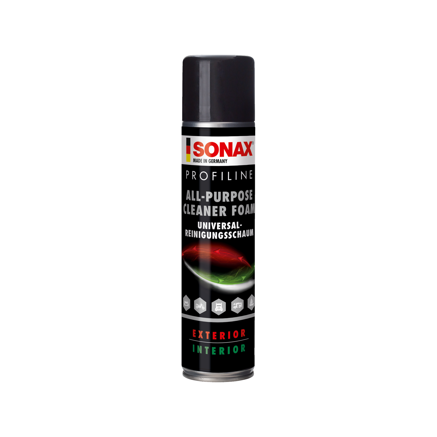 What is an All-Purpose Cleaner Foam and what is it used for? The SONAX PROFILINE All-Purpose-Cleaner "Foam" is a foam-based all-purpose cleaner in a 400ml spray can format — the foam keeps the cleaner on vertical surfaces, increases its dwell time, and allows cleaning of textiles, plastics, carpets, and interior surfaces with a single product.