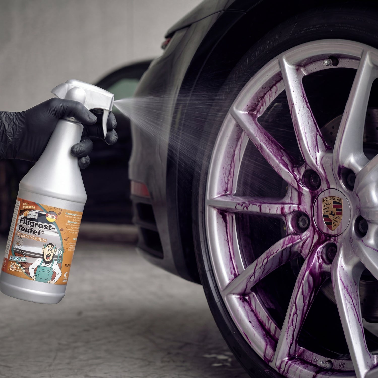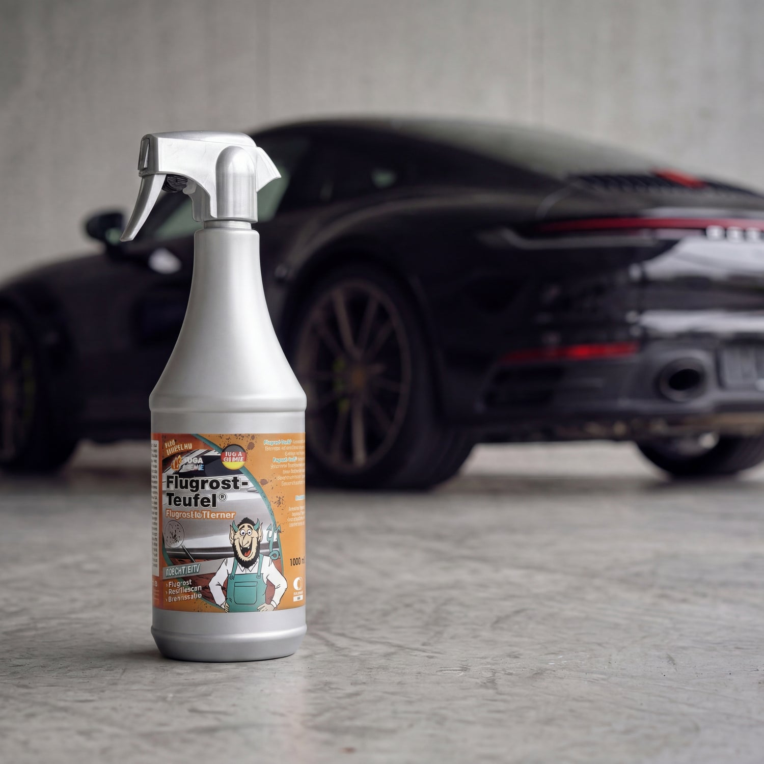 TUGA Chemie Rust Stain Devil 1L chrome spray bottle with orange label on concrete forecourt in front of black Porsche 911