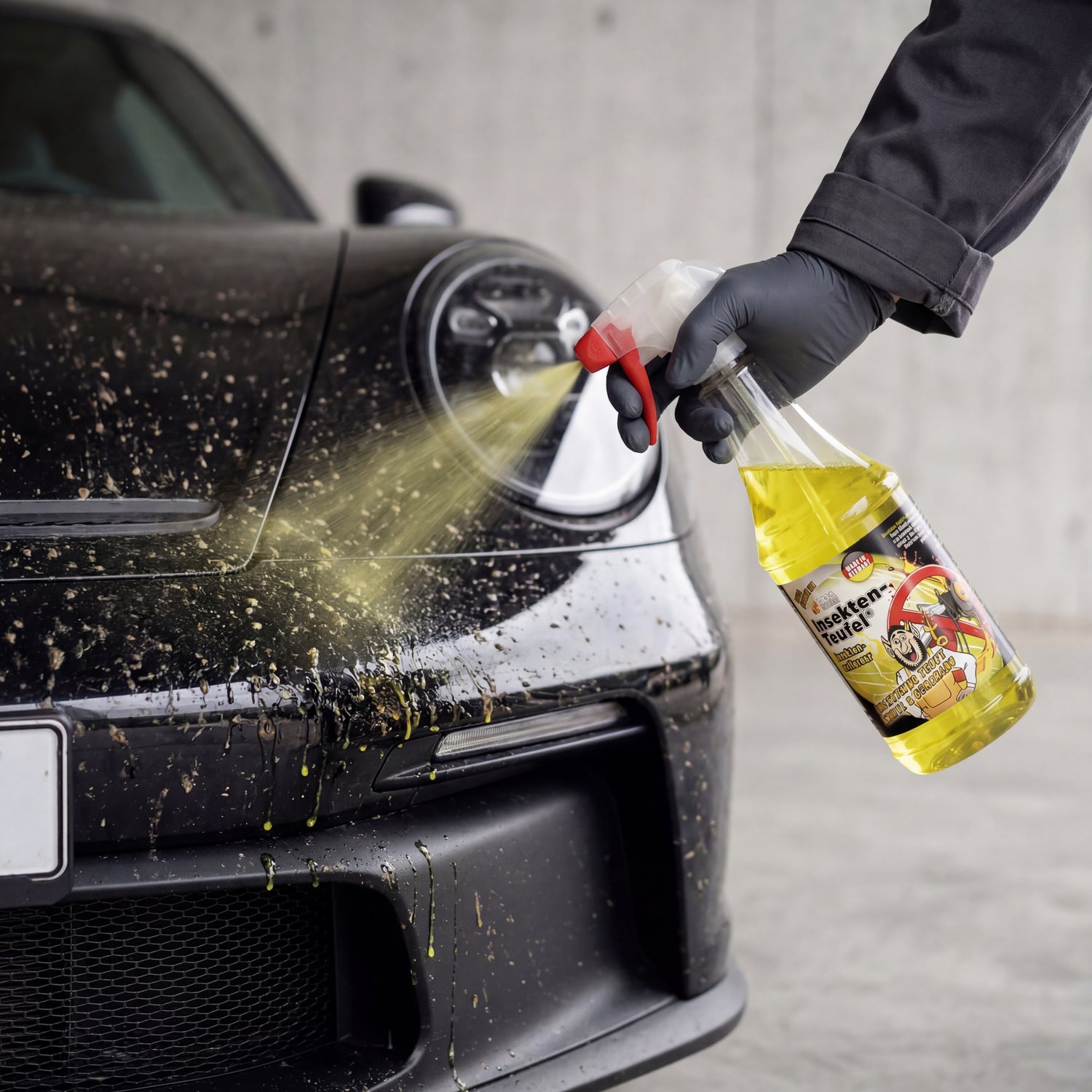 TUGA Chemie Insect-Devil 1L spray bottle on concrete forecourt in front of black Porsche 911