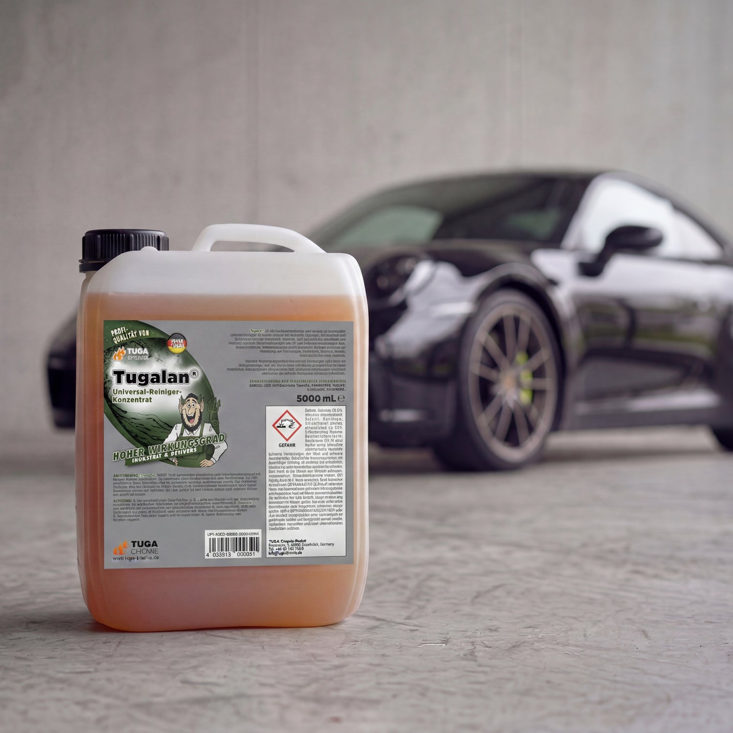 TUGA Chemie Tugalan 5-liter canister with amber-colored concentrate and green label on a concrete forecourt in front of a black Porsche 911