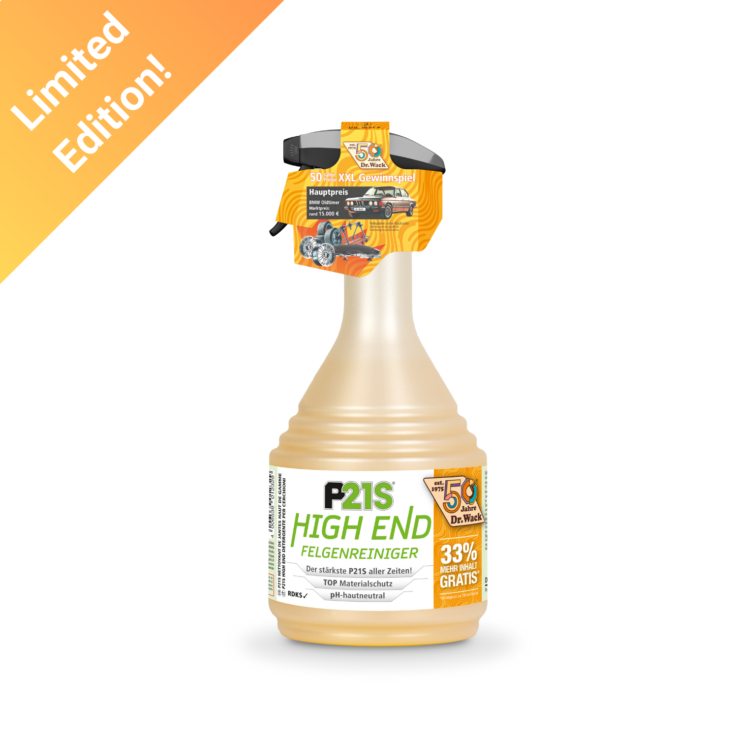 Der P21S "High End" Felgenreiniger überzeugt durch kompromisslose Reinigungsergebnisse – selbst dort, wo andere Produkte an ihre Grenzen stoßen. Bremsstaub und eingebrannte Partikel lösen sich vollständig, ohne Nacharbeiten oder Bürstenzwang. Die Felgen erhalten ihren ursprünglichen Glanz zurück, ohne matte Rückstände oder Schlieren. Seine hohe Materialverträglichkeit macht ihn ideal für alle Felgentypen, auch verchromte oder polierte Oberflächen. Selbst bei kalten Temperaturen bleibt die Wirkung stark, was ihn zum perfekten Ganzjahresreiniger macht. Für eine vollständige Pflege empfehlen wir, nach der Reinigung eine Felgenversiegelung wie Dr. Wack P21S Felgen-Wachs aufzutragen – das schützt langfristig vor Neuverschmutzung und erleichtert die nächste Reinigung.