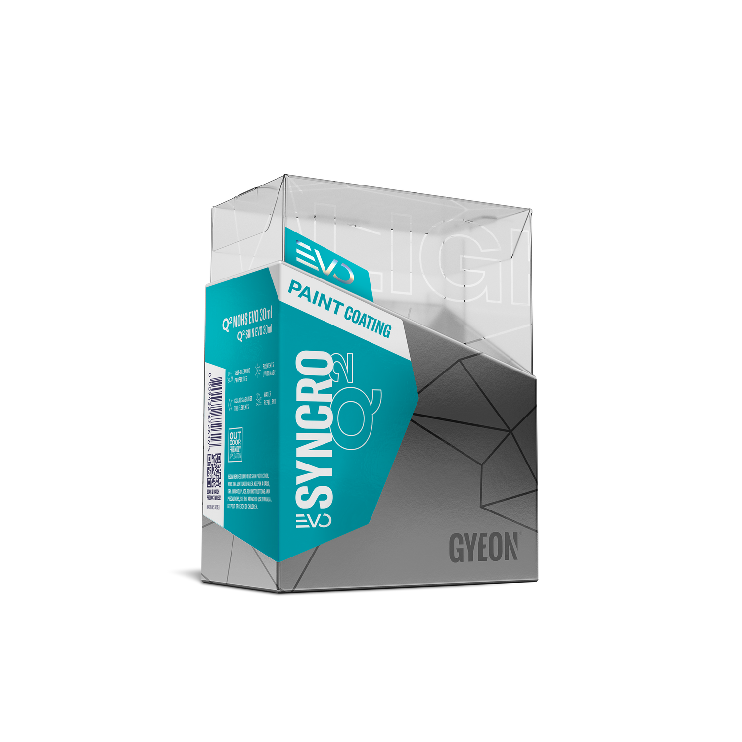 GYEON Q² Syncro EVO Paint Coating ist eine 2-stufige Keramikversiegelung aus Base- und Top-Coat. Sie bietet extremen Tiefenglanz, ausgeprägte Hydrophobie und eine mögliche Standzeit von bis zu 48 Monaten bei professioneller Anwendung.
