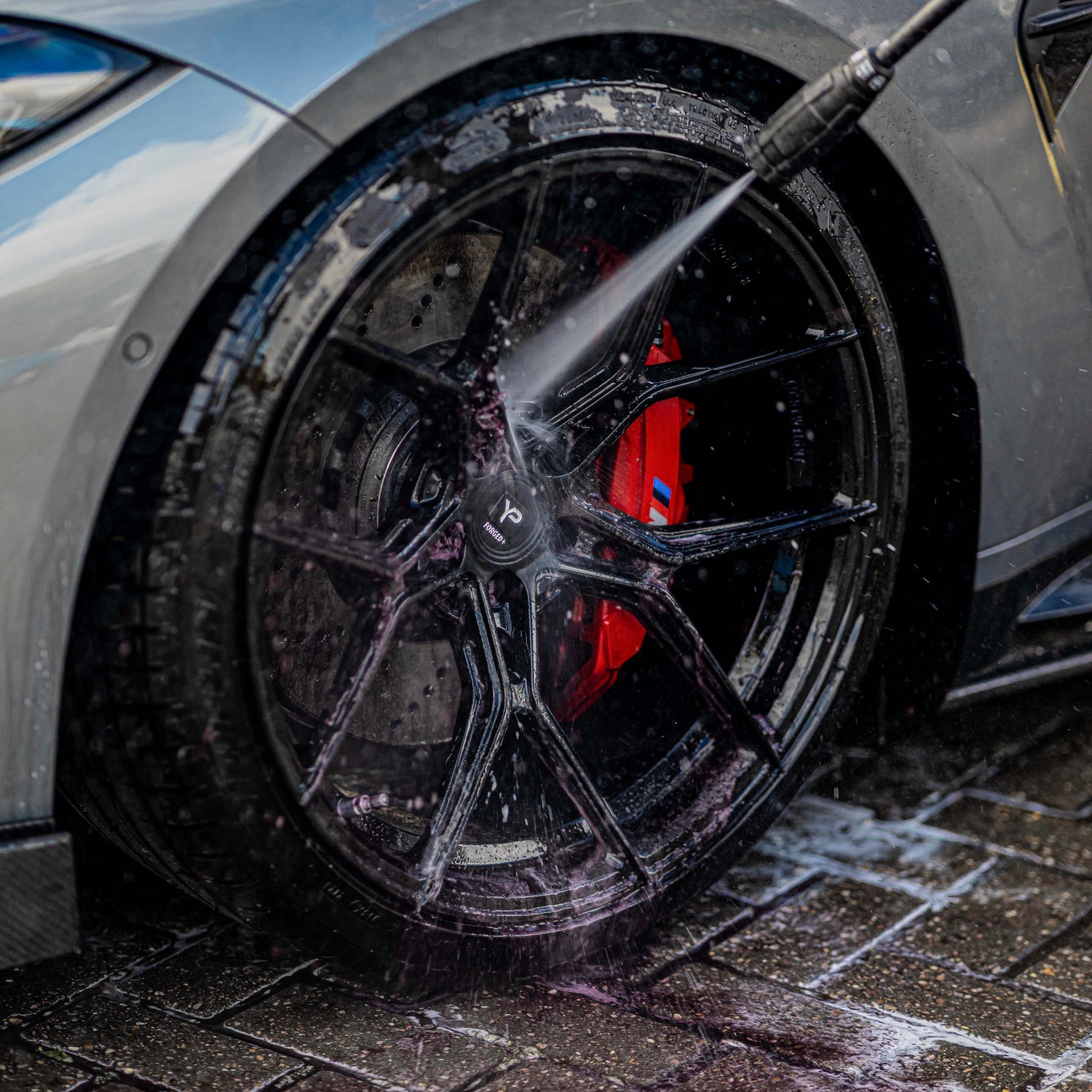 Im Wäscheworkflow empfehlen wir, die Felgen vor der eigentlichen Fahrzeugwäsche zu reinigen: Q²M Iron WheelCleaner aufsprühen, einwirken lassen und abspülen – erst dann die Karosserie waschen. So werden keine Felgenreiniger-Spritzer auf den frisch gewaschenen Lack gebracht. Für stark verschmutzte Felgen: erst grob mit Hochdruck vorabspülen, dann WheelCleaner aufsprühen, nach der Einwirkzeit mit Felgenbürste arbeiten und nochmals mit Hochdruck abspülen. Die vollständige Reinigungssequenz: WheelCleaner → Abspülen → Felgenbürste für Detailstellen → Abspülen → Trocknen → Versiegelung mit Q² Rim EVO.