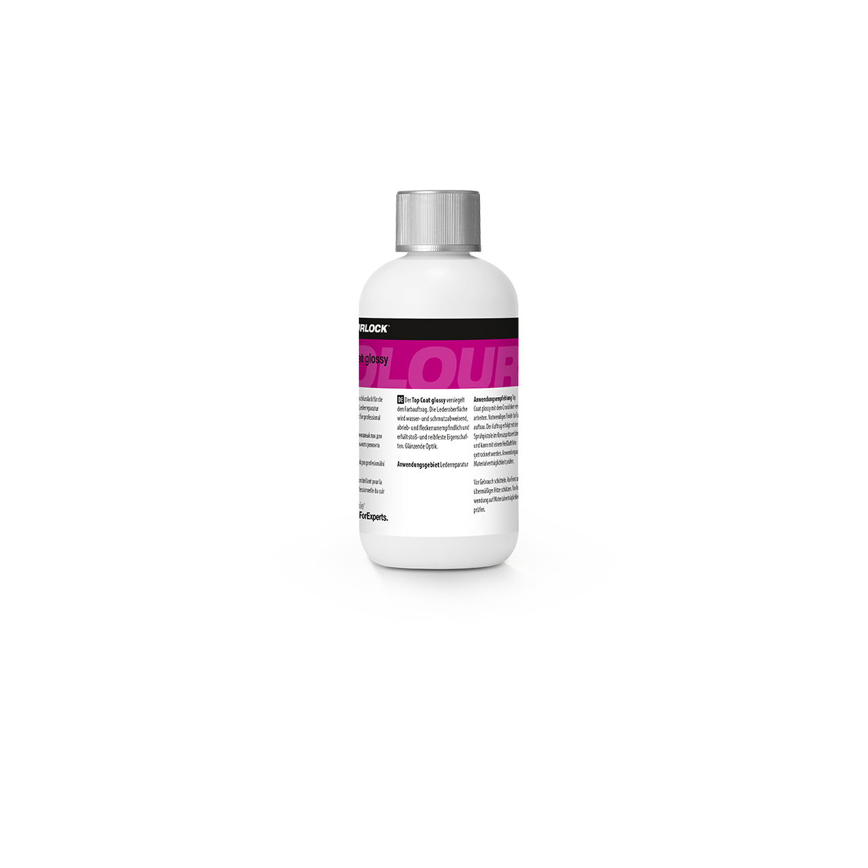 Was macht COLOURLOCK Top Coat Glossy? — Der glänzende Abschlusslack versiegelt farblich repariertes Leder, schützt vor Abrieb und Schweiß und erzeugt ein gleichmäßig glänzendes, hochwertiges Finish für Möbel-, Fashion- und Interieurleder.